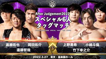 6. After Judgement 2022 Special Six Man Tag Match: Konosuke Takeshita, Yuki Ueno y Toi Kojima derrotaron a Tetsuya Endo, Yusuke Okada y Yuya Koroku (22:11) con un Triangle Choke de Kojima sobre Koroku.
