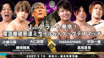 7. JADO Alert Issued! Electric Blast Jado Road Missile Death Match: Atsushi Onita, Shunma Katsumata y Toi Kojima vencieron a HARASHIMA, Soma Takao y Kazuki Hirata (13:55) con un Current Blast Bat Full Swing de Katsumata sobre Hirata