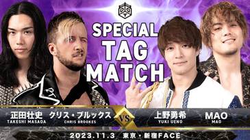 7. Special Tag Match: Yuki Ueno y MAO vencieron a Chris Brookes y Takeshi Masada (22:08) con un Rolling Guillotine-Style Ace Crusher de Ueno sobre Masada