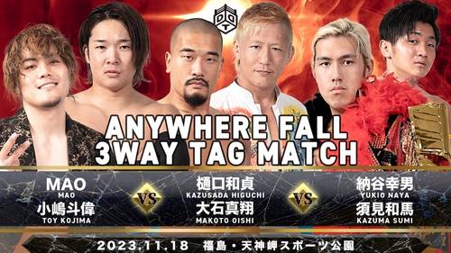 1. Falls Count Anywhere 3 Way Tag Match: Kazusada Higuchi y Makoto Oishi vencieron a MAO y Toy Kojima y a Yukio Naya y Kazuma Sumi cuando Higuchi colocó espaldas planas a Kojima con un Diving Body Press desde una escalera sobre una mesa (51:35). (Réferi Especial: Shunma Katsumata)