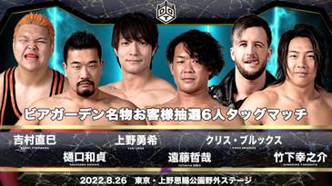 6. Beer Garden Specialty Customer Lotttery Six Man Tag Match: Konosuke Takeshita, Naomi Yoshimura y Tetsuya Endo vencieron a Kazusada Higuchi, Yuki Ueno y Chris Brookes (18:20) con un Jumping Knee de Takeshita sobre Brookes