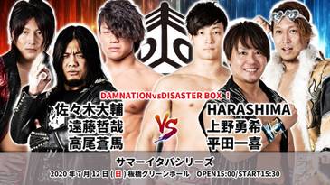 7. DAMNATION vs. DISASTER BOX!: Daisuke Sasaki, Tetsuya Endo y Soma Takao vencieron a HARASHIMA, Yuki Ueno y Kazuki Hirata (17:50) con la Gin Tonic de Takao sobre Hirata.