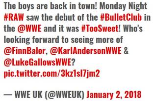 Siguen los efectos de la sorpresiva reunión entre Luke Gallows y Karl Anderson, The Club, con su antiguo compañero de batallas en Japón, Finn Bálor, la noche de ayer primero de enero de 2018 en Monday Night Raw, en esta ocasión, una cuenta oficial de WWE en Twitter los nombró como el “Bullet Club”… ¿Qué ocurrió?
