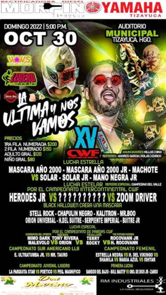 Es así que el próximo 30 de octubre, después de 15 años CWF se despedirá de los fans de la lucha libre en el Auditorio Municipal de Tizayuca, donde presentará una función con otro luchas.