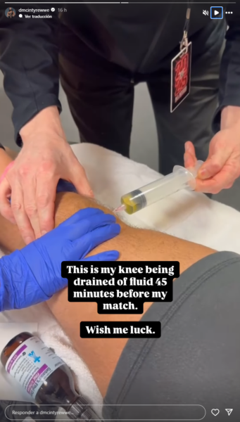 Pero ahora no hablamos del durante ni del después sino del antes. McIntyre muestra en sus redes sociales que previo al show tuvo que pasar por el médico para que le drenaran líquido de la rodilla.