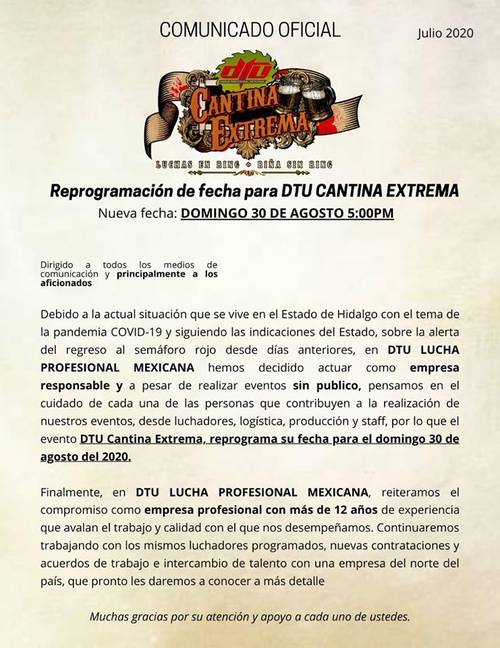 «En DTU Lucha Profesional Mexicana, hemos decidido actuar como empresa responsable y a pesar de realizar eventos sin público, pensamos en el cuidado de cada una de las personas que contribuyen a la realización de nuestros eventos
