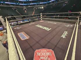 La lona es muy al estilo de UFC, dado que está llena de publicidad. En el centro de la lona aparece el logo de Fortnite. Y también están los logos de Riyadh Season, publicidad de Arabia Saudita. El logo de la cerveza de Hulk Hogan, Real American Beer.