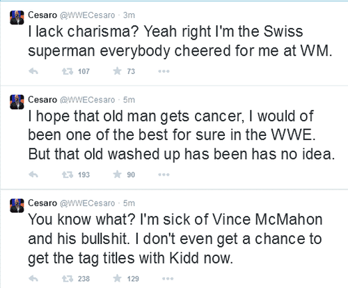 Los tweets en principio se escribían en primera persona, de parte de Cesaro, y se quejaban de manera agresiva de su falta de empuje, las críticas recibidas y el manejo de Vince McMahon.