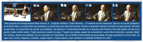«Han ganado los enmascarados Blue Demon Jr., el Águila Solitaria, Ciclón Ramírez. El misterio de las máscaras. Éste es el mundo fantástico de la lucha libre. La lucha libre que apasiona. La lucha libre que llena siempre las arenas. Porque el luchador siempre da todo en cada función. Da todo lo que tiene. La lucha libre los corroe, los cristaliza, los destruye. Y solamente triunfan en el ring los más fuertes o los más sabios. El ring es la guerra: todos contra todos.Todos avanzan cuando no caen. Y sobre los caídos, pasan los vencedores. Lucha libre homicida y suicida. Ballet sin música, drama sin palabras. Es un carnaval sin Colombina. Es un desfile interminable de personajes. Es algo grandioso la lucha libre. Es algo real e irreal, religioso y profano, magia negra y magia blanca, pero siempre un estallido brillante de color”.
