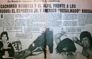 “Pues nada, amigos, como habíamos anticipado la semana que pasó, los rudos fueron nuestros favoritos y ellos ganaron la lucha estrella de apuestas máscara-cabellera contra máscara-cabellera del viernes pasado. Los que no son consentidos del fanático, Américo Rocca y El Espectro Junior, fueron los ganadores de la batalla principal del viernes contra El Alfil y Cachorro Mendoza, técnicos que hicieron hasta lo imposible por la victoria.