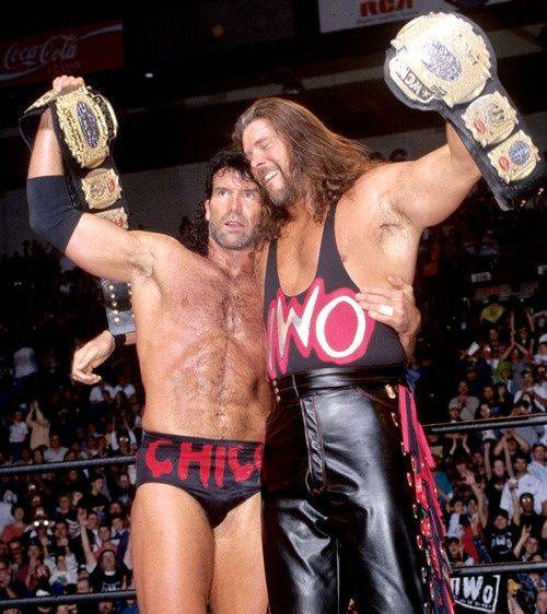: Scott Hall y Kevin Nash.Anuncio«Probablemente sigan recibiendo cheques con regalías por haber sido Diesel y Razor Ramon, pero estoy seguro de que no están a la altura de los verdaderos cheques que estarán recibiendo de la mercancía de la nWo. No hay más preguntas, señoría».