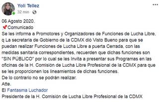 Se les informa a Promotores y Organizadores de Funciones de Lucha Libre, quela Secretaria de Gobierno de la CDMX, dio visto bueno para que se puedan realizar Funciones de Lucha Libre a puerta cerrada, con las medidas sanitaria correspondientes.AnuncioRecuerden que dichas funciones son «SIN PÚBLICO» por lo cual se les Invita a presentar sus programas en las oficinas de la H. Comisión de Lucha Libre Profesional de la CDMX para que se les proporcionen los lineamientos de dichas funciones.