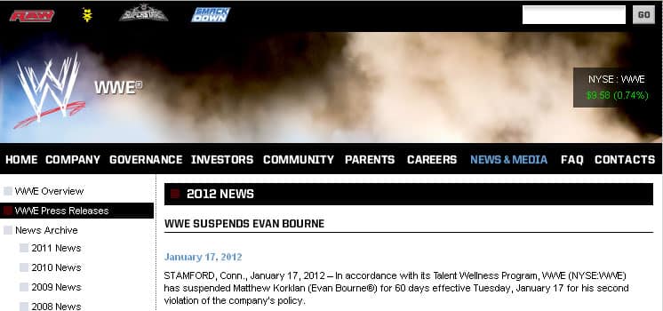 WWE ha anunciado por medio de su página web Corporativa Oficial, Corporate.WWE.com, que el Superstar Evan Bourne ha sido suspendido por 60 días por su segunda violación al Programa de Bienestar de Talentos, la compañía y la sanción es efectiva a partir del día de hoy martes 17 de enero de 2012.