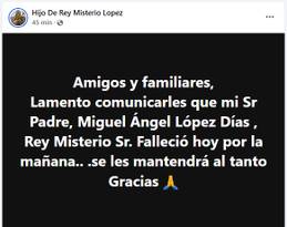 «Amigos y familiares, lamento comunicarles que mi Sr. Padre, Miguel Ángel López Díaz, Rey Misterio Sr., falleció hoy por la mañana.»