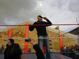 Las máscaras, parte de la fusión de la lucha y la música / Foto J.M VacahRecuperándose, al fondo la música y el público espectante / Foto de J.M. Vacah