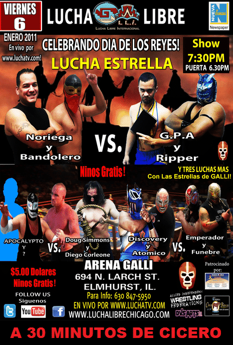Nuestros amigos de GALLI presentarán un atractivo cartel en su Arena en Elmhurst, IL. esta ocasión con 7 luchas a una caída y donde los pequeños de la casa no pagarán nada.