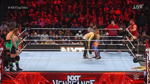 En la cuarta lucha del especial NXT Vengeance Day 2023, vimos a Mark Coffey y Wolfgang, de Gallus, sorprender a todos y convertirse en los nuevos Campeones de Parejas NXT. Lograron vencer a Pretty Deadly (Elton Prince y Kit Wilson), a Chase University (André Chase y Duke Hudson) y los exmonarcas, The New Day (Kofi Kingston y Xavier Woods) en poco más de 16 minutos.