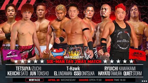 6. Six Man Tag Team 3 Way Match ~ #STRONGHEARTS vs. BULK ORCHESTRA vs. 60 Seconds: Ryuichi Kawakami, Hayato Tamura y Quiet Storm vencieron a Tetsuya Izuchi, Keiichi Sato y Jun Tonsho und T-Hawk, El Lindaman e Issei Onizuka (21:54) de un Jackammer de Tamura sobre Onitsuka.