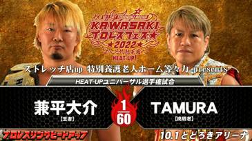 6. HEAT UP Universal Title: Daisuke Kanehira (c) venció a TAMURA (22:44) con lBlack Country defendiendo el título