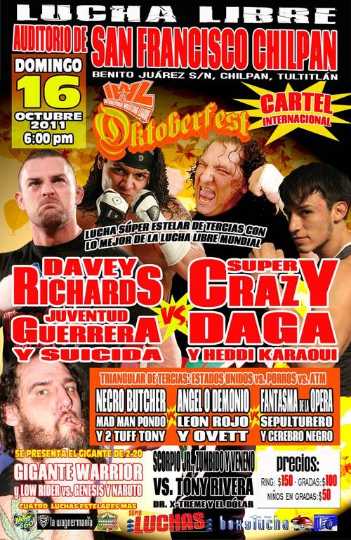 Llega el tercer cartel de la gira Oktoberfest de la International Wrestling League (IWL) con grandes encuentros, el cuál se desarrollará este domingo 16 de octubre en el Auditorio de San Francisco Chilpan de Tultitlán, donde el Campeón Internacional de Peso Completo Jr. de IWL, Daga podría llegar como el nuevo World Champion de Ring Of Honor (ROH). Ya que un día antes enfrentará a Davey Richards por su título en la Unidad Deportiva Javier Rojo Gómez en Tulancingo, Hidalgo.