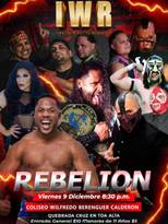 La empresa IWR (Inmortal Wrestling Revolution) presentan su evento REBELION este próximo viernes 9 de Diciembre en el Mini Coliseo Wilfredo Berenguer en Toa Alta a las 8:30 pm. El Presidente de la IWR, el Sr. Oquendo ha confirmado el primer encuentro por el Campeonato Mundial de la IWR, El Cuervo se enfrenta a Bellito Calderón y El Profe estará esposado al Presidente Oquendo. Haciendo su regreso a la IWR, La Función Positiva de Julio Jimenez y Zcion RTI se midiran a la pareja mas caliente del area oeste, The Star Brothers.