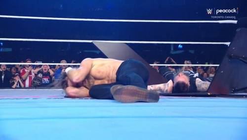 Sami siguió resistiendo y de forma impresionante sacó una silla con alambre de púas con la cual golpeó la espalda de su «amigo» y después le estrelló la cara contra el mismo utensilio, para rematarlo con un fuerte azotón sobre la misma, aunque el conteo no prosperó.