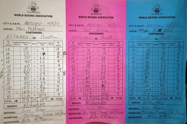En la siguiente imagen se muestran las tarjetas de los jueces del combate de Wladimir Klitschko contra Alexander Povetkin.