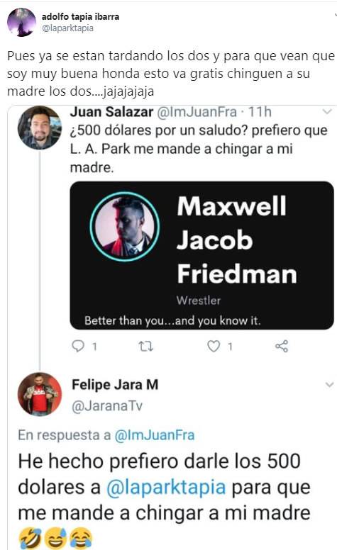 «¿500 dólares por un saludo? prefiero que L. A. Park me mande a chingar a mi madre«, publicó el aficionado Juan Salazar, lo que fue apoyado por otro usuario de nombre Felipe Jara, «De hecho prefiero darle los 500 dólares a @laparkatapia para que me mande a chingar a mi madre».