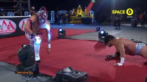 El duelo comenzó con Laredo Kid y Hijo del vikingo pero tras varios minutos de movimientos ágiles, Myzteziz Jr. ingresó al ring para continuar con los ataques aéreos.