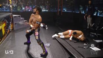 Pero las cosas no salieron bien para Kushida, quien terminó sobre la mesa de comentaristas, mientras que Nash Carter también quedó muy lastimado en el suelo.