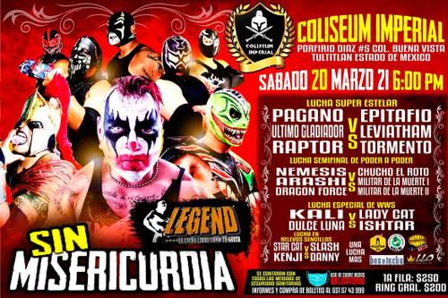 Será el próximo sábado 20 de marzo cuando la empresa LEGEND, dirigida por Manuel Flores, reanude actividades, después de una segunda pausa prolongada durante esta pandemia. La función, denominada Sin Misericordia, se celebrará en las instalaciones del Coliseum Imperial, en la colonia Buenavista, municipio de Tultitlán, Estado de México.