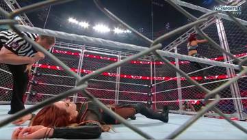 Ya en la jaula, Bayley comenzó golpeando a su rival, pero pronto Becky retomó el control del combate e incluso terminó estrellando contra la reja a su contrincante.