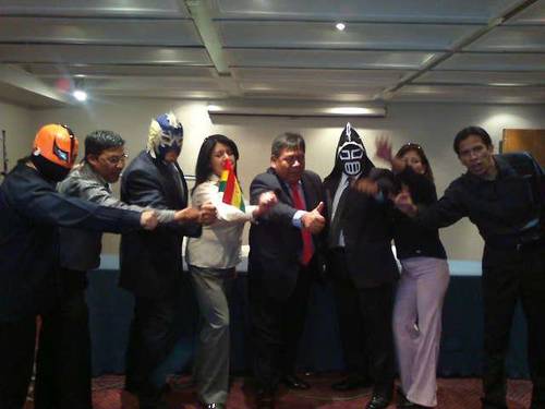 Por Franklin Juvenal Kapquequi: Hola amigos de Súper Luchas – Superluchas.net: El día de ayer, arribaron al aeropuerto El Alto, los luchadores mexicanos Kung Fu, Cripya y Dunkel, para el Mega Evento de Lucha Libre Internacional en La Paz, Bolivia. Ellos fueron recibidos de la mejor manera con nuestras representantes, Las Cholitas Luchadoras (típicas de