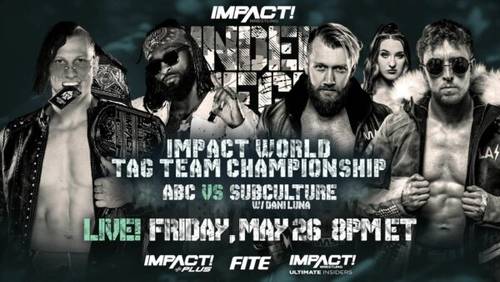 - CAMPEONATO MUNDIAL DE PAREJAS IMPACT: ABC (Ace Austin y Chris Bey) (c) vs. Subculture (Mark Andrews y Flash Morgan Webster) (con Dani Luna)Anuncio