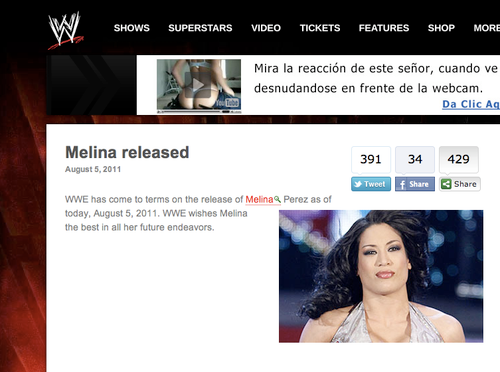 Tradicionalmente los viernes son los días en que WWE anuncia sus recortes, y este 5 de agosto ha sido la diva de raices latinas, Melina Pérez, quién ha sido despedida de la empresa Recordemos que hasta hace poco Melina se había convertido en la estelar del roster femenil, pero tras lesiones y reportes de comportamiento