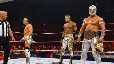 Más adelante, el mexicano siguió haciendo de las suyas, atacando a Fletcher y Okada, aunque casi se cae subiendo a las sogas, pero pudo mantener el equilibrio y mandó a volar a Fletcher con una linda corbata y Okada y Fletcher recibieron patadas voladoras.