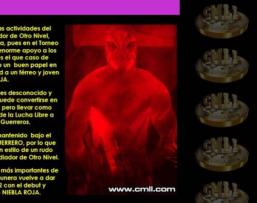 AnuncioNIEBLA ROJA es un luchador que para muchos es desconocido y resulta un enigma para sus adversarios, lo cual puede convertirse en un arma más a su favor al no conocer su estilo, pero llevar como compañero a uno de los máximos exponentes de la Lucha Libre a nivel mundial como lo es el Líder de los Guerreros.