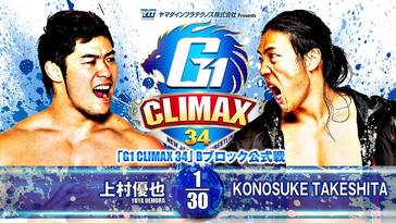 9. G1 Climax – Grupo B: Yuya Uemura [6] venció a Konosuke Takeshita / [4] (23:11) con un Kannuki Suplex Hold.