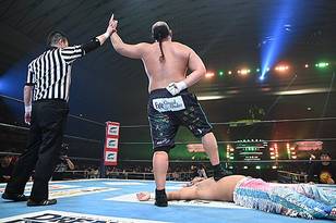 Shota contraatacó con un suplex explosivo, pero el público de Osaka, que todavía recordaba el año pasado, lo recibió con abucheos. Al darse cuenta de que tenía que luchar solo, Umino siguió adelante. Incluso después de librarse del Deathrider, Great-O-Khan se enfureció y lo derribó con brutales codazos. Umino mostró espíritu de lucha, pero otro duro derechazo y un Eliminator lo acabaron para llevarse la derrota.