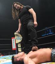A continuación dirigió su mirada al cinturón del Campeonato Mundial de Peso Completo IWGP y lo levantó, dejando de manifiesto su interés en desafiar a SANADA. Para terminar, levantó su brazo haciendo la señal de Los Ingobernables de Japón.