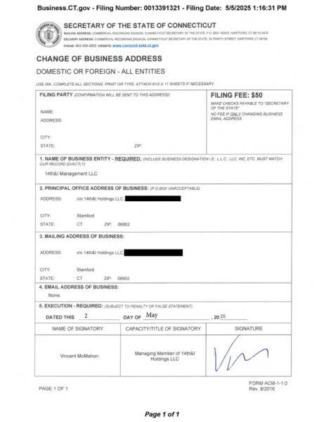 Las tres entidades fueron constituidas en Delaware y comparten la misma dirección principal en Stamford, Connecticut. McMahon, el ex CEO y presidente de WWE, figura como miembro gerente de al menos dos de las entidades, mientras que 14TH & I Holdings está listada como miembro de las otras.