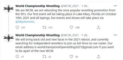 «Somos WCW, estamos reiniciando la popular promoción de lucha libre de los 90. Nuestro primer evento se llevará a cabo en Lake Mary, Florida, el 10 de octubre de 2021 y todas las grabaciones, eventos en vivo y espectáculos se llevarán a cabo a través de