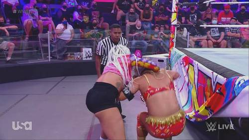 López sacó una caneca de basura debajo del ring, pero B-FAB la golpeó, aunque luego López con una especie de Spear lastimó a B-FAB al tirarla contra la escalera metálica. Los hombres de Legado del Fantasma y Hit Row se fueron a los golpes y así nos fuimos a comerciales.