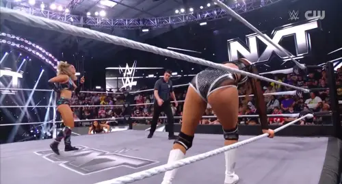 Sinclair luego sorprendió a Kendal con tacleada a la pierna, y esta reaccionó con cruceta, pero la sacó del ring con una patada en el trasero y luego le dio cuatro rápidos machetazos al pecho.