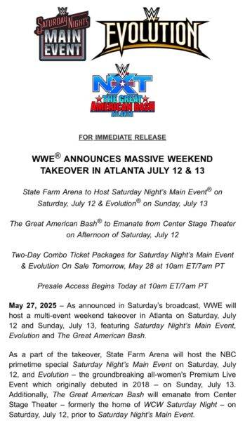 Como ya intuimos, según informa vía comunicado WWE, NXT The Great American Bash 2025 se celebrará la tarde del 12 de julio desde el Center Stage Theatre de Atlanta (Georgia, EEUU), antes de Saturday Night’s Main Event XL, sin concretar su horario