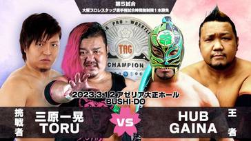 5. Osaka Pro Tag Team Title: HUB y GAINA (c) vencieron a Kazuaki Mihara y TORU (26:49) con la Moudoku Habu Kuubaku de HUB sobre TORU defendiendo el título.