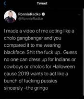 «Hice un video actuando como a un gángster latino y hablan de mí como si me hubiera pintado la cara negra. ¡Tranquilícense! Supongo que nadie se puede disfrazar de indio o de vaquero o de gángster para Halloween, porque 2019 requiere que actuemos como un grupo de maricas. Sinceramente, el gringo».