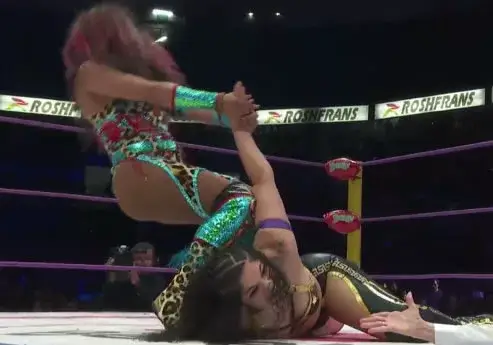 La mexicana recuperó el control al lanzar a Moné contra la barrera de protección, pero luego falló un vuelo y terminó impactando accidentalmente a Olympia en ringside.