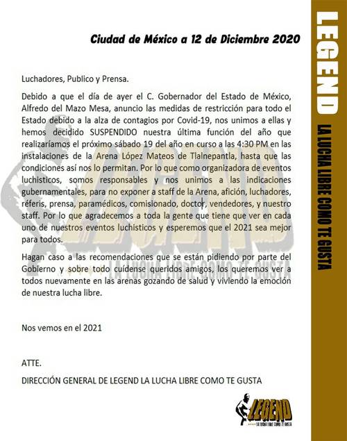 Es así, que la promotora LEGEND lanzó un comunicado, donde anunció que la función del 19 de diciembre que se realizaría en la Arena López Mateos,