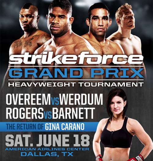 “Estamos realmente emocionados de ir a Dallas con dos excepcionales peleas de cuartos de final de nuestro Grand Prix pesado,” dijo el CEO de Strikeforce Scott Coker. “Con Overeem vs. Werdum, Rogers vs. Barnett, así como el regreso de Gina Carano, STRIKEFORCE está trayendo unos de sus mejores carteles al American Airlines Center.”